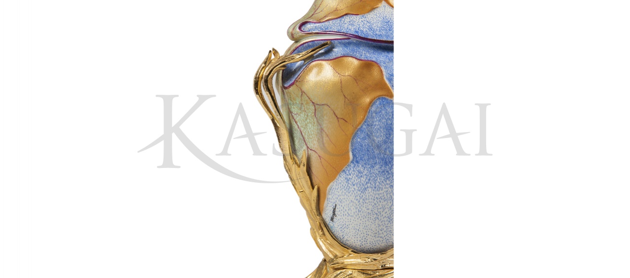 Ваза с широким волнообразным венчиком богато украшена при помощи различных декоративных приемов в лучших традициях стиля барокко. Фарфоровая поверхность тулова покрыта кобальтовым напылением, создающим эффект пастели. Рисунок вазы создают рельефные листья, выделенные красками цвета матовой бронзы с переливами. Изящная бронзовая подставка вазы, плавно переходящая в ее же ручки, выполнена на растительные мотивы. Декор вазы навевает мысли об осени, золотые листья которой кружат на фоне еще летнего, но уже не такого яркого голубого неба. Фабрика Mangani — обладательница одного из самых известных итальянских брендов — является ведущей в своей отрасли и с начала XIX века производит высококачественные изделия из фарфора в сочетании с другими материалами.