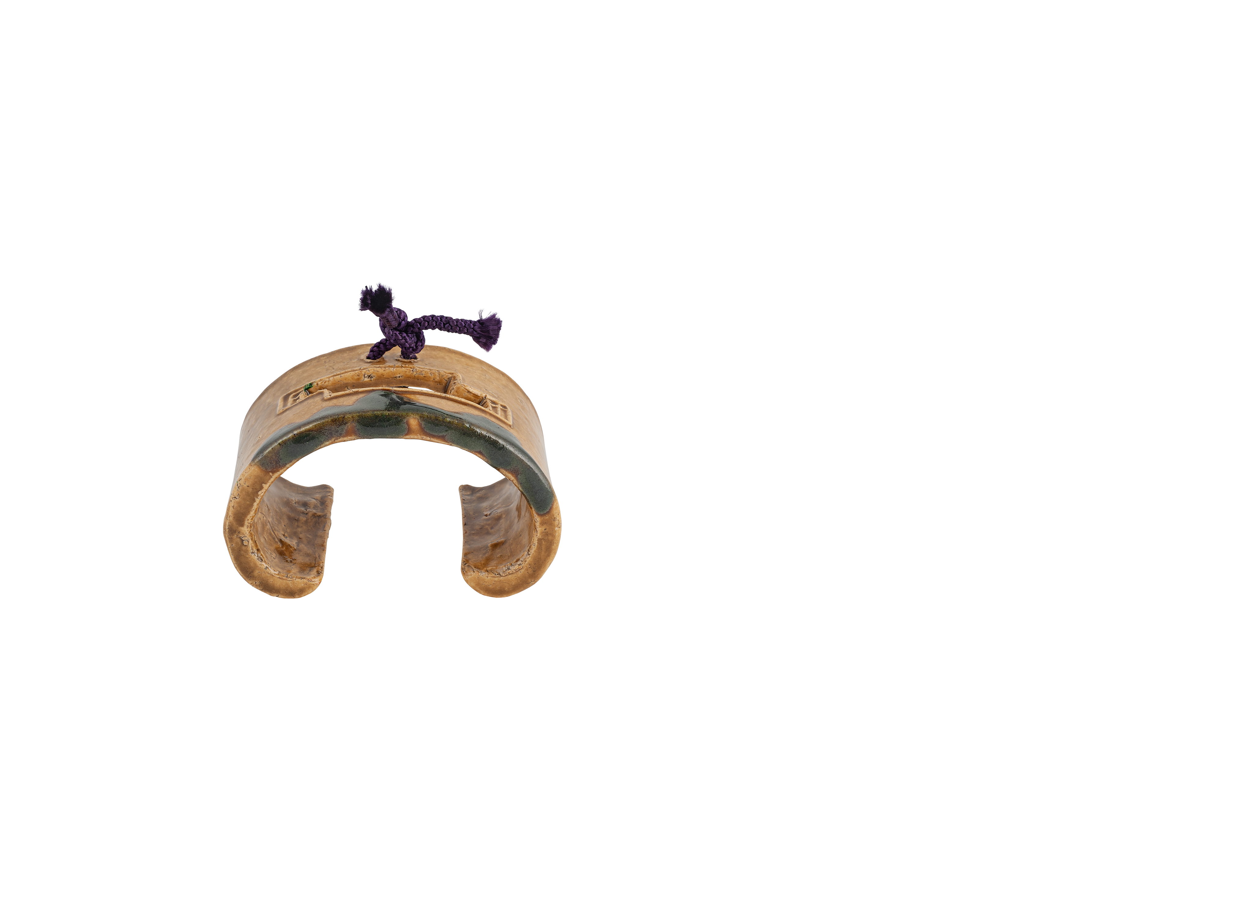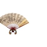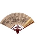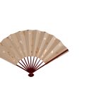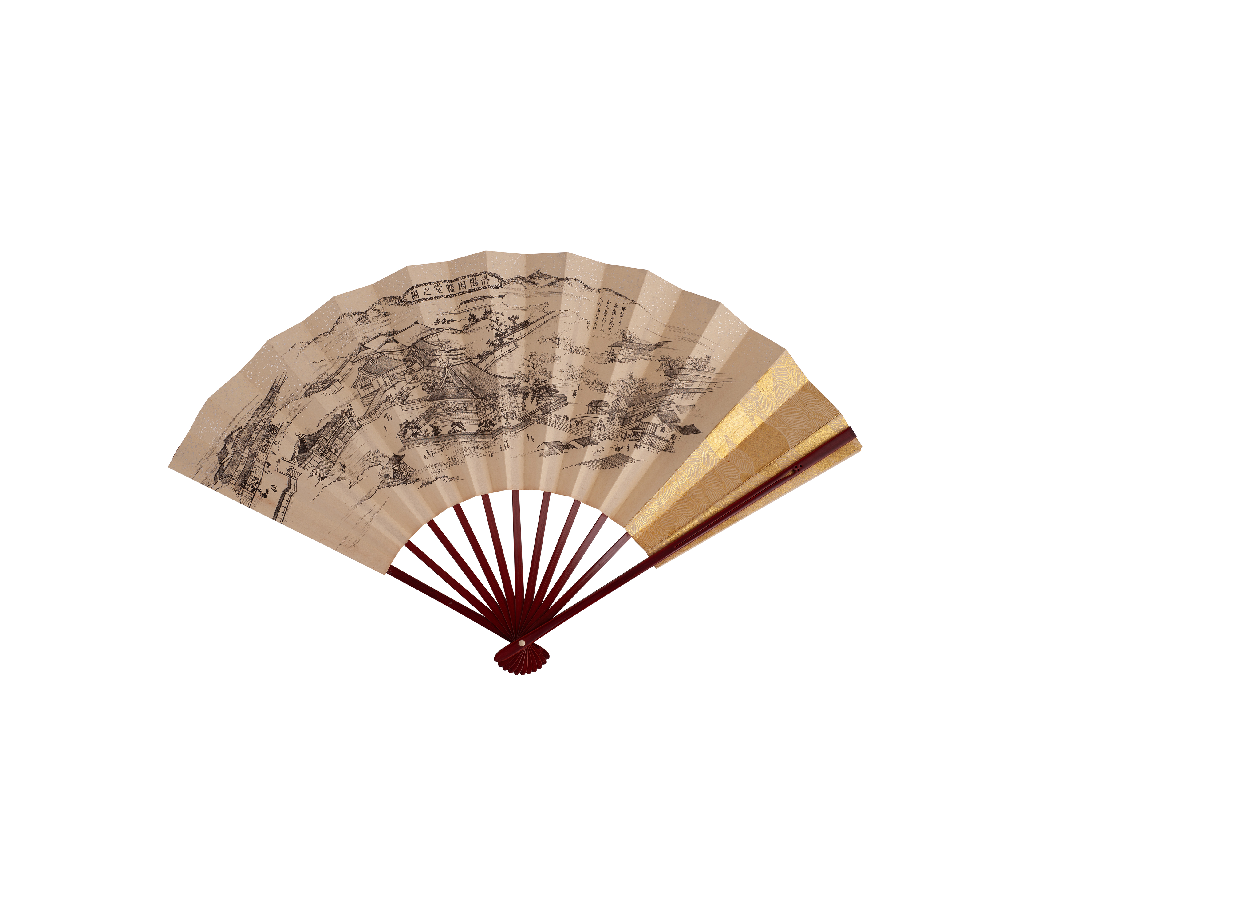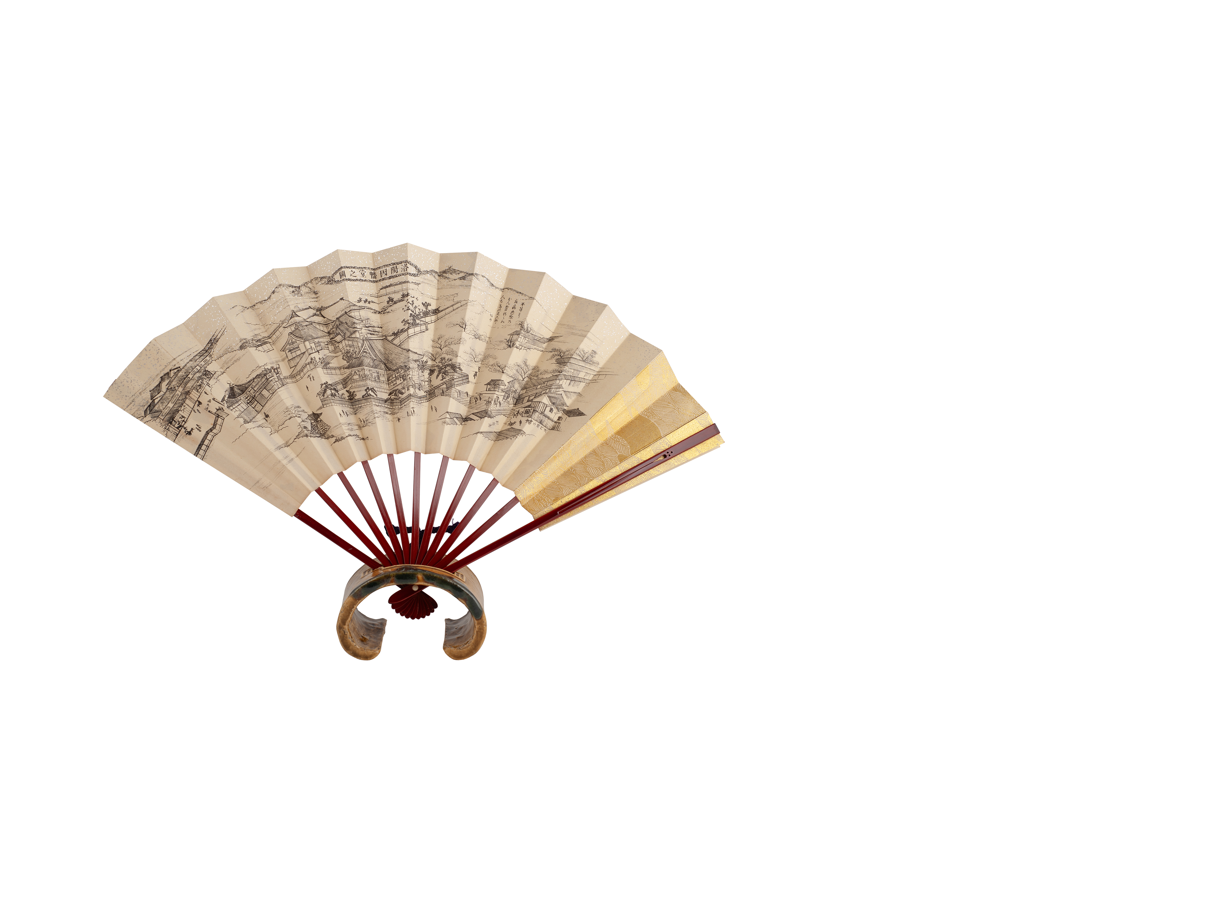 Складной веер с изображением зала Инаба-до (народное название буддийского храма Бёдодзи в Киото) представлен на глазурованной керамической подставке. Остов веера деревянный и покрыт традиционным лаком уруси , а экран выполнен из бумаги и декорирован золотистой фольгой.