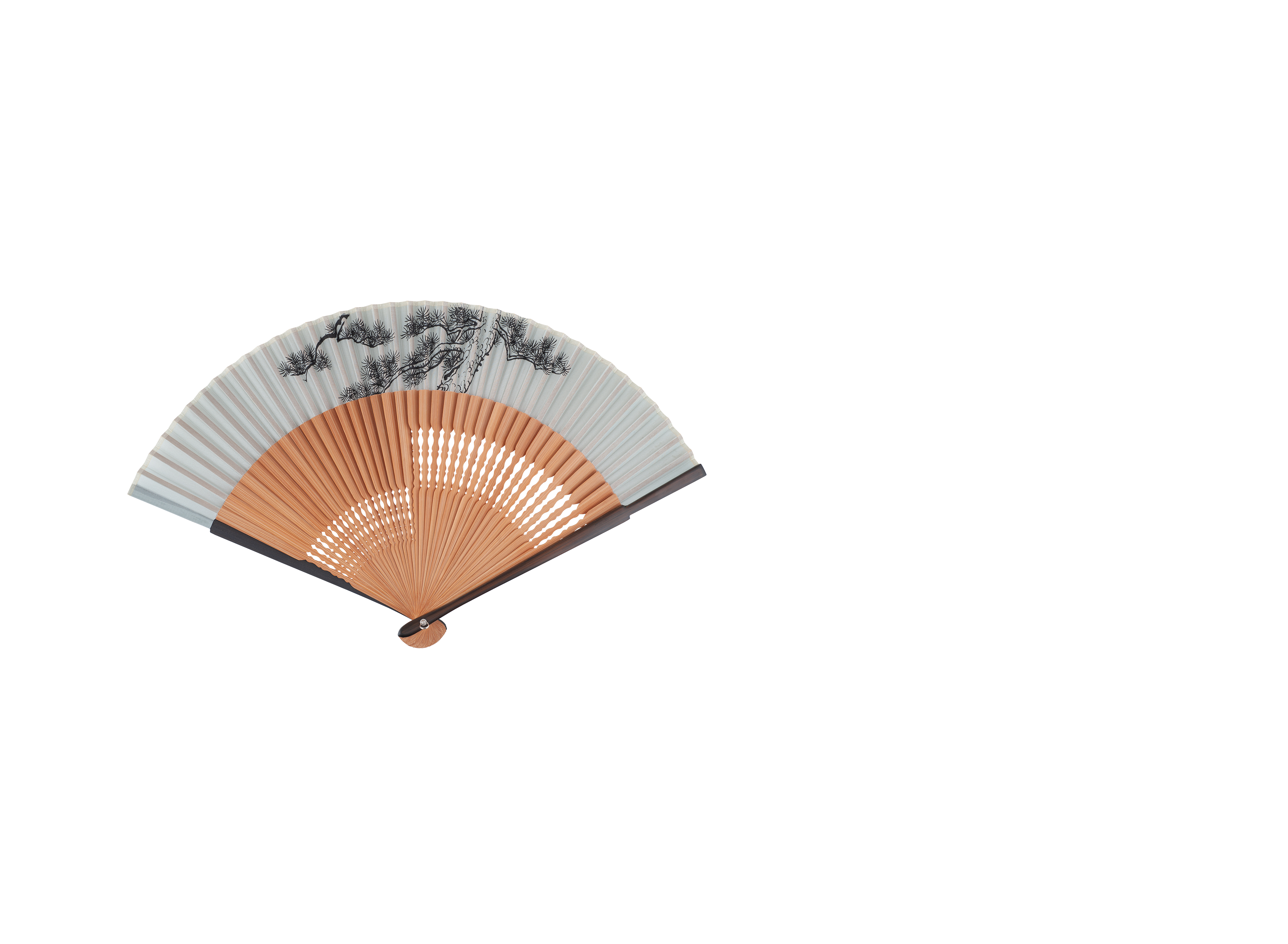 Веер изготовлен в киотской мастерской Мияваки Байсэнан, истоки которой восходят к 1823 году. Декоративное оформление веера в виде образа сосны имеет благопожелательное значение стойкости и долголетия.