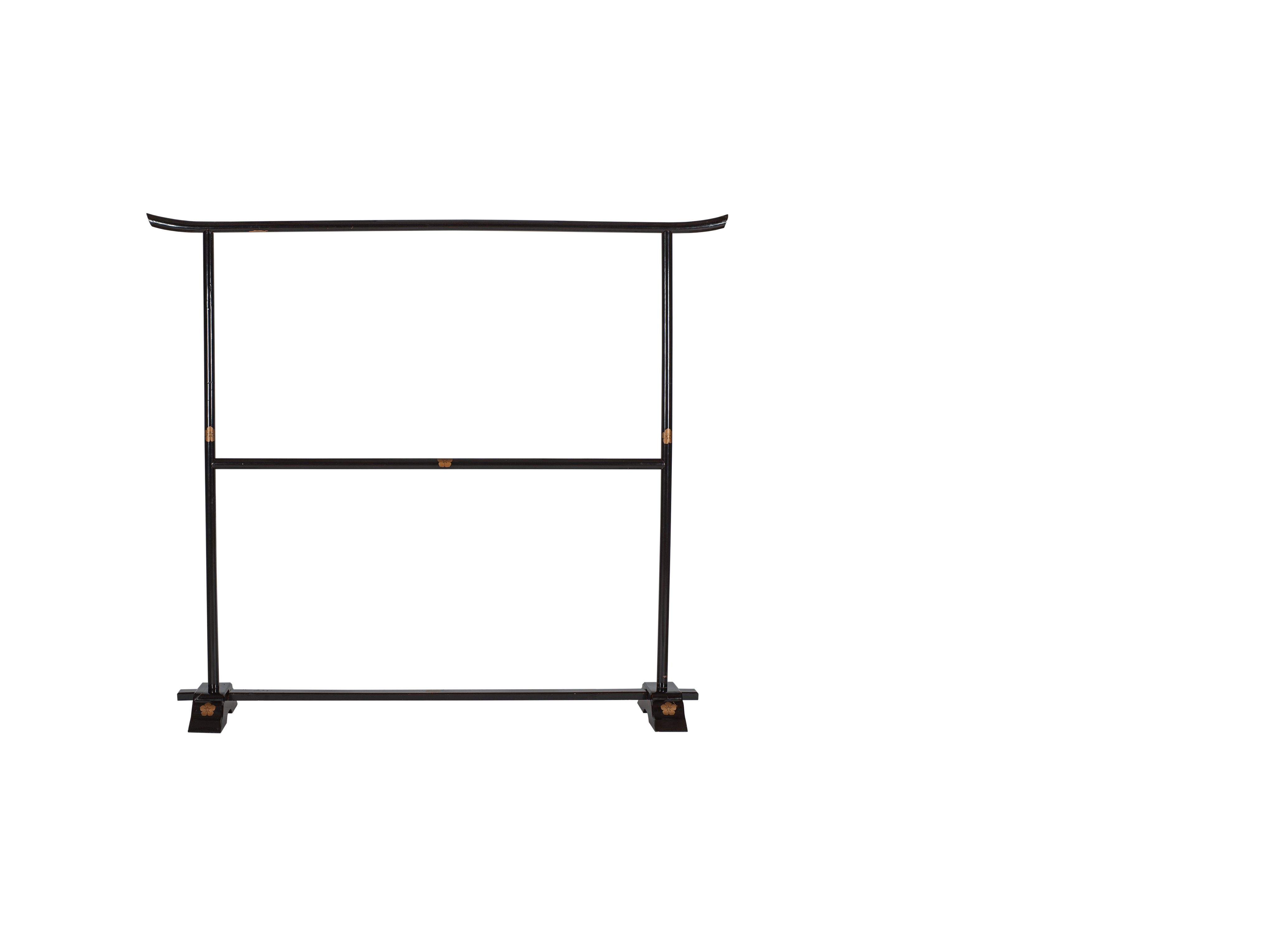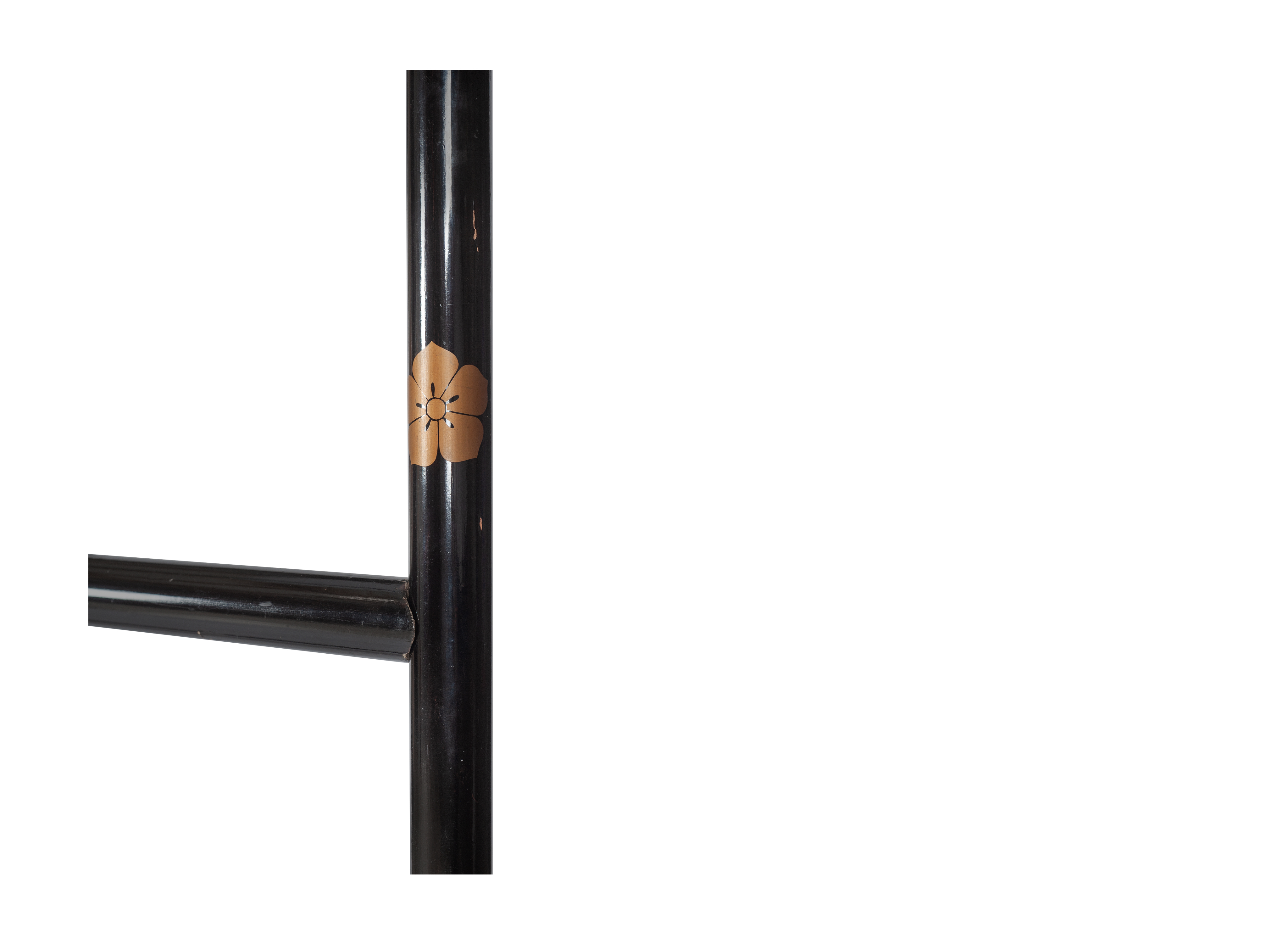 Кимоно-какэ (или вешалка для кимоно) выполнена из дерева, покрыта лаком уруси и оформлена изображением кикё-мон (герб в виде цветка колокольчика).
