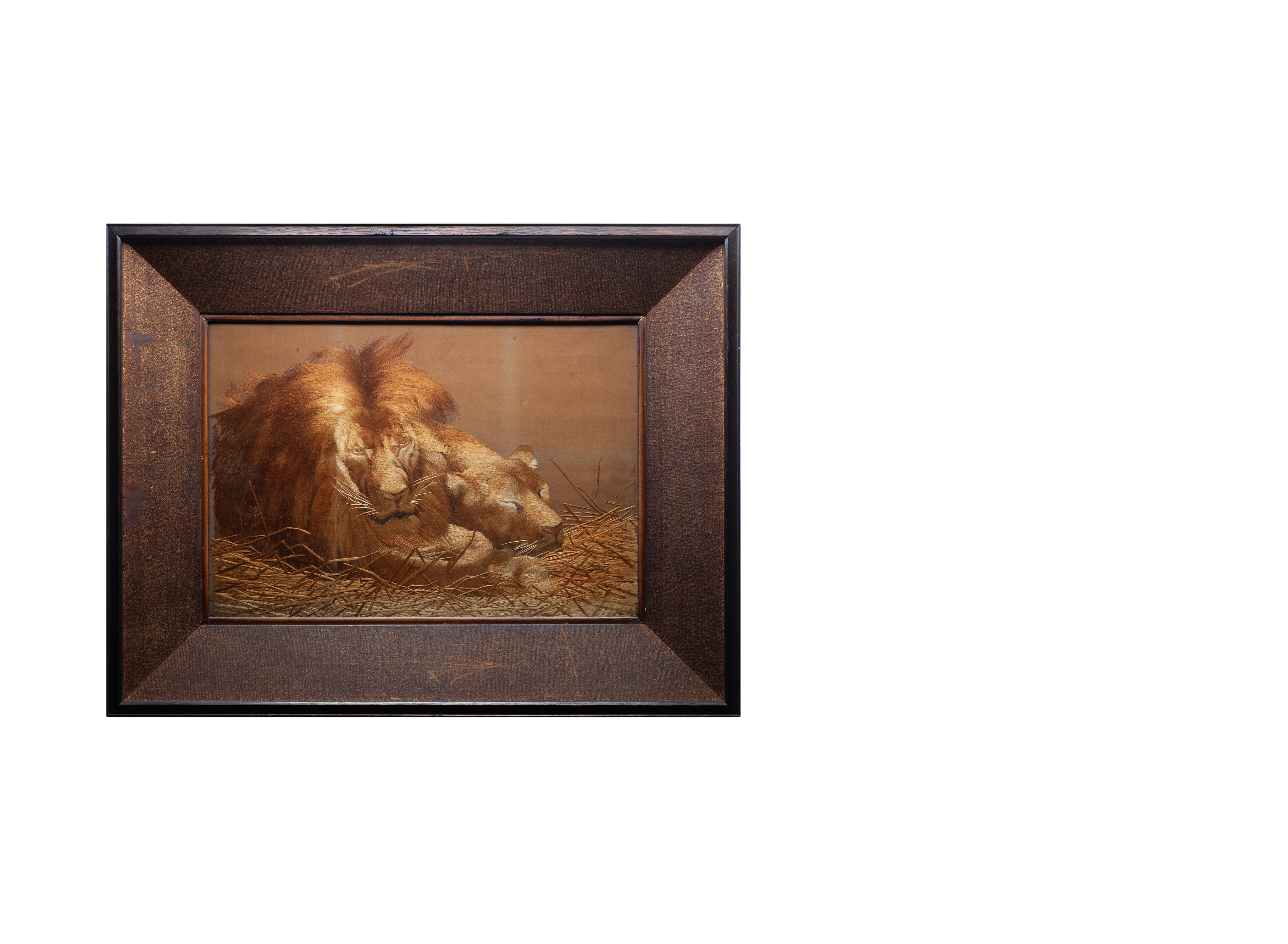 Предмет представляет собой вышитую шелковыми нитями картину с изображением льва и львицы. Запечатленный образ является повторением более ранней работы с аналогичной композицией. Реалистичные изображения львов в японском искусстве наиболее часто встречаются начиная с эпохи Мэйдзи (1868-1912), когда страна была открыта после более чем 200-летней самоизоляции.