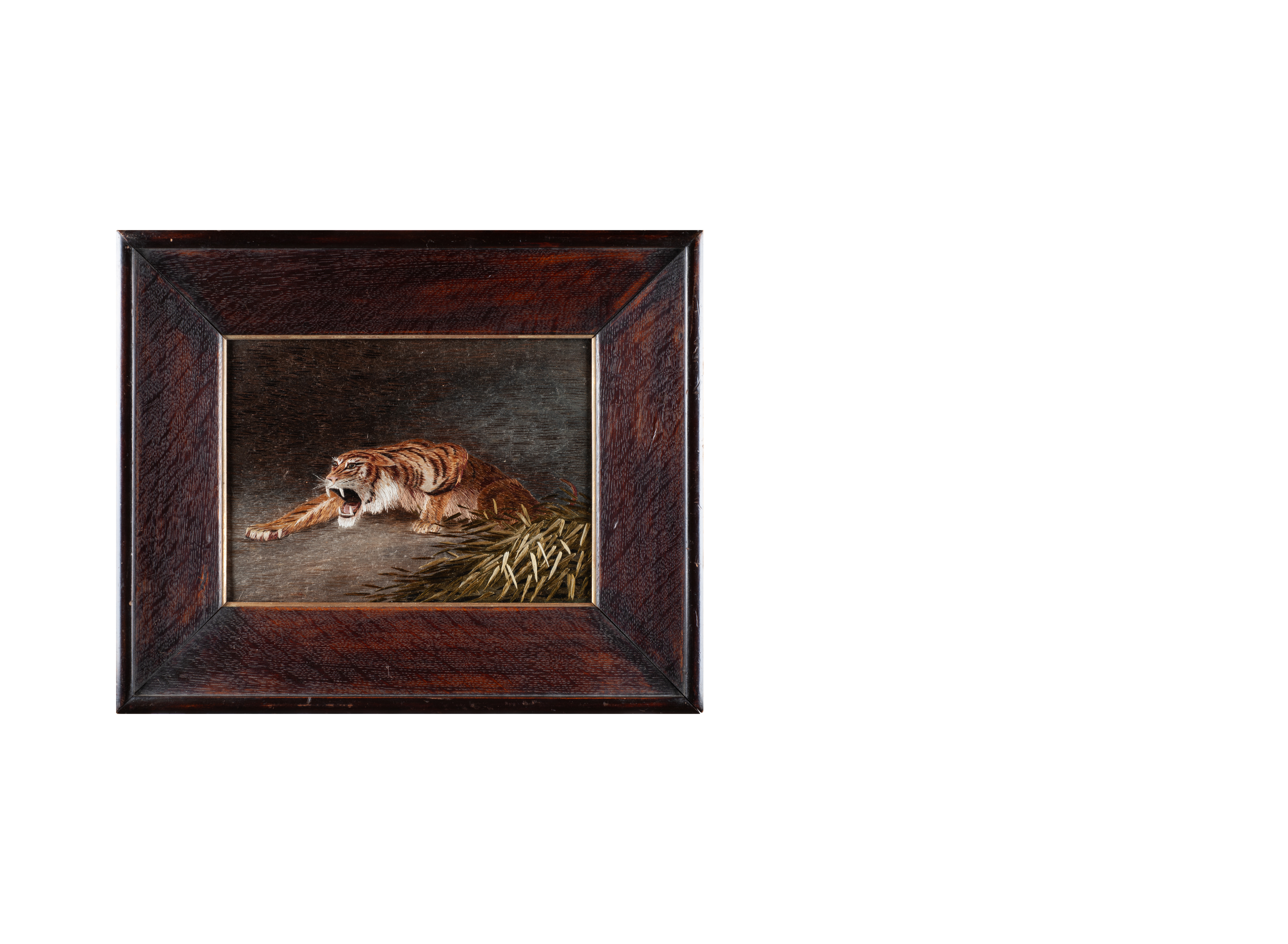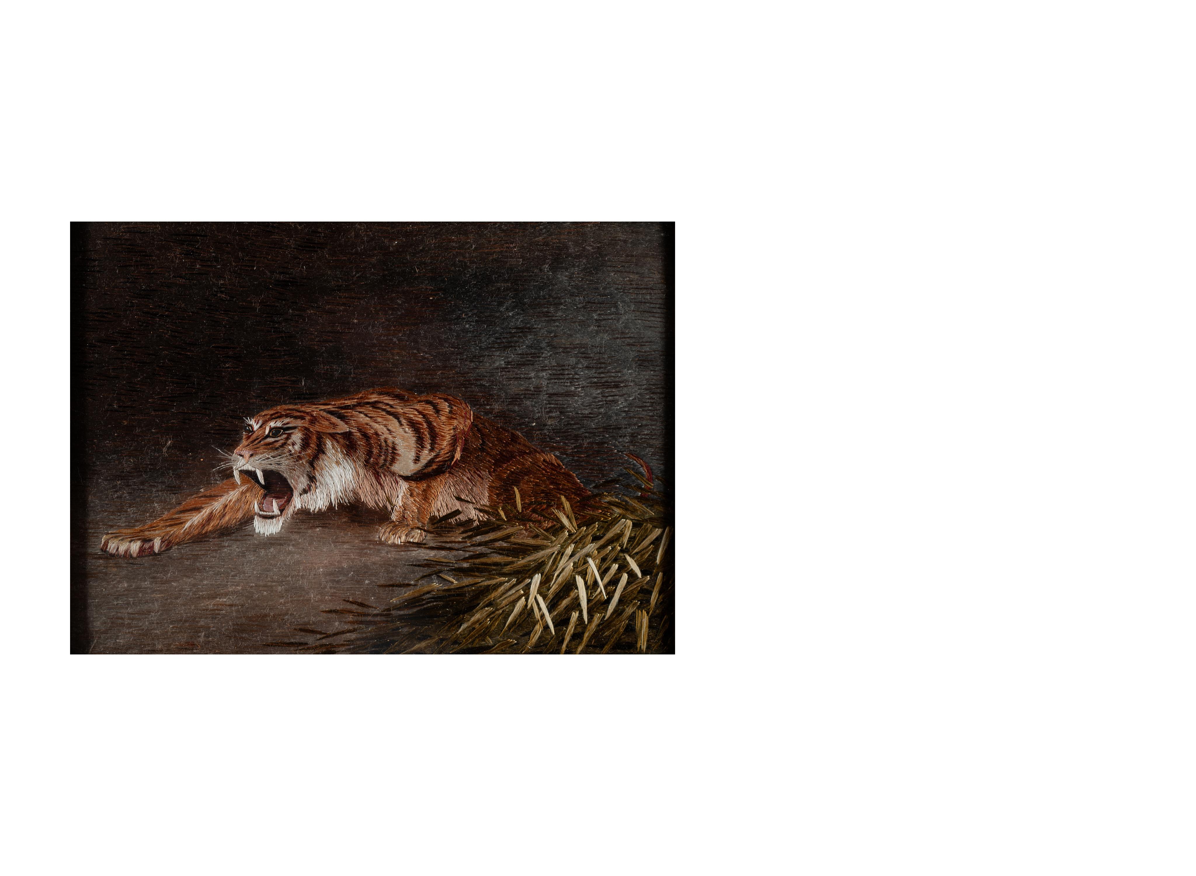 Несмотря на то, что на территории Японии тигры не обитают, с древних времен они являются символом силы и мужества. Представленная вышивка с изображением тигра, вероятно, является репликой более ранней работы. Эта небольшая вышитая картина отличается стилизацией и обобщением образа, тем не менее композиция обладает пространственной глубиной изображения, а техника наложения стежков передает различные фактуры.