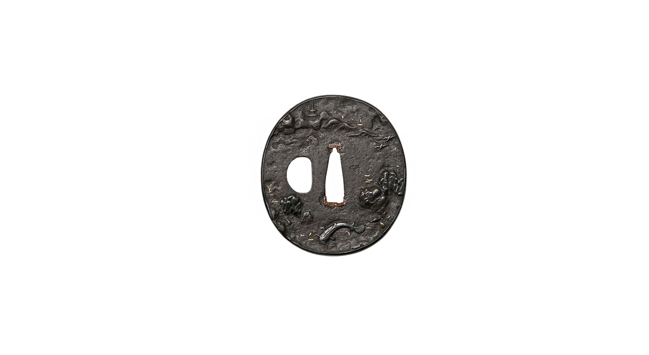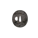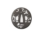 Железная цуба круглой формы в стиле сукаси-бори , с двумя отверстиями кодзука-хицу и когаи-хицу .