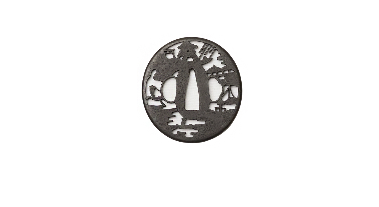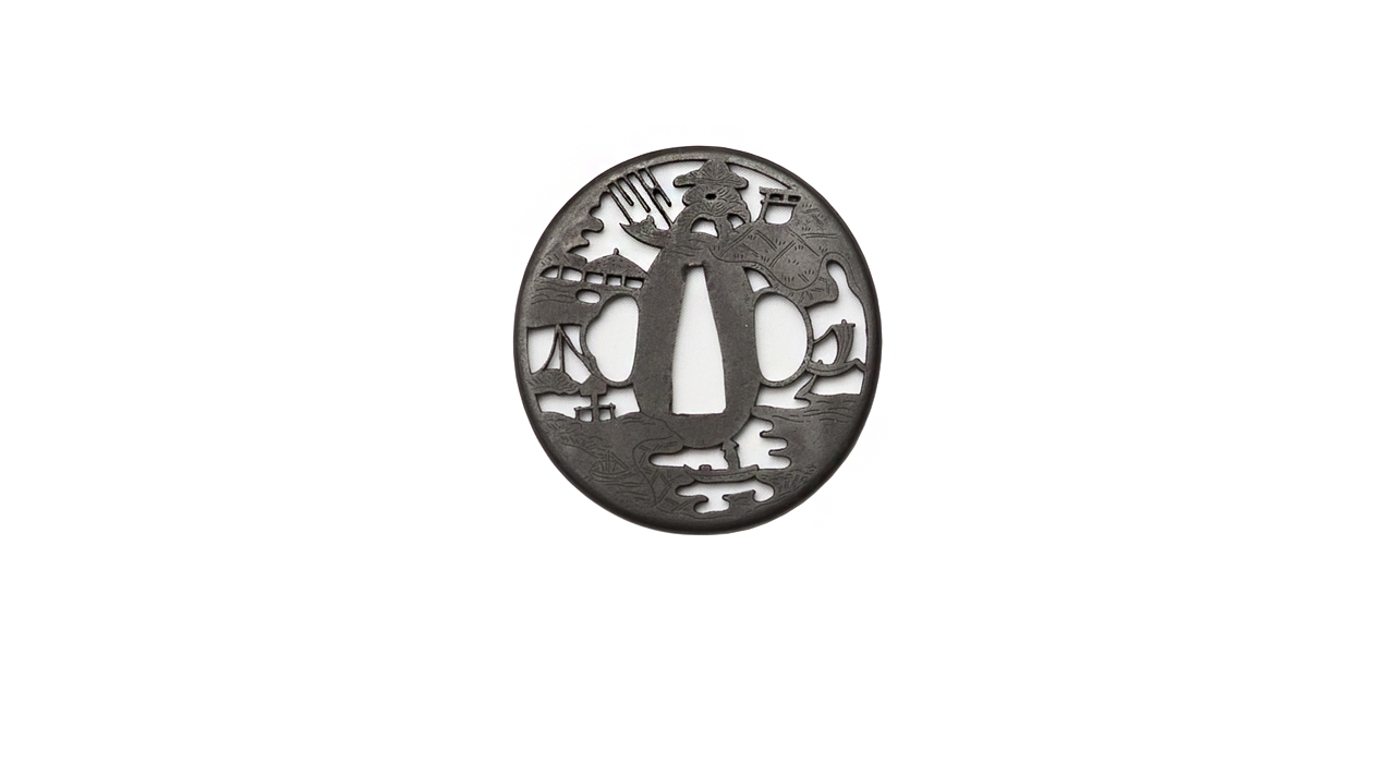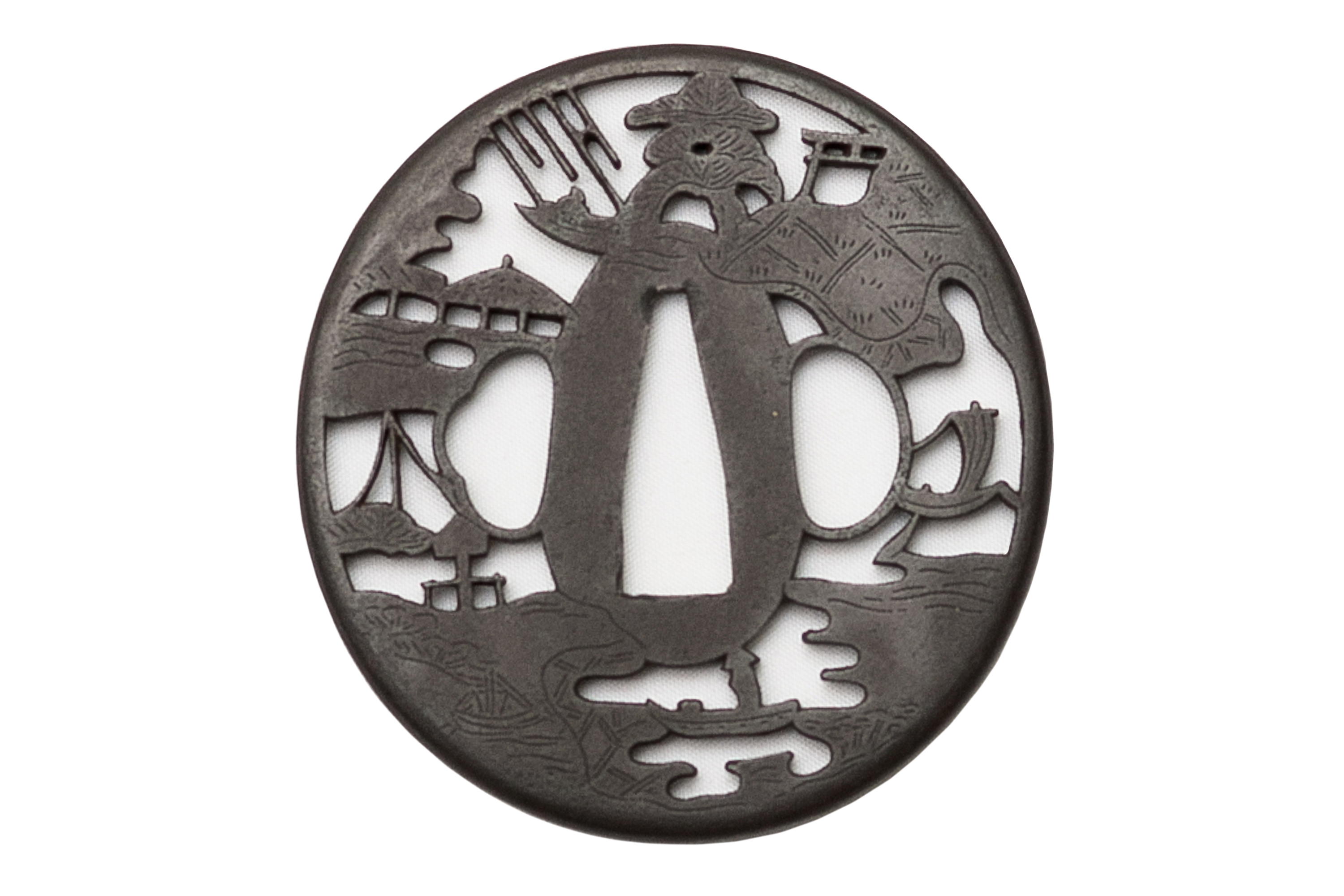 Железная цуба круглой формы в стиле сукаси-бори , с двумя отверстиями кодзука-хицу и когаи-хицу . Орнаментирована в технике гравюры (перфорация, сочетание позитивного и негативного силуэтов); мотив — изображение силуэтов лодок, деревьев, крыш, синтоистских символов. Напоминает стиль перфорированных цуба школы Акасака . Имеет подпись: 菊永直芝 — Кикунага Наосиба.